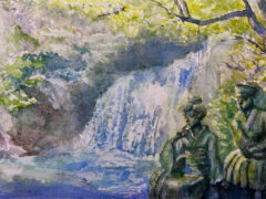 The challenge in this work was capturing the powerful presence of the waterfall using the delicate medium of watercolor.