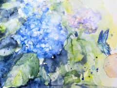 This watercolor piece captures the bird’s dazzling colors, paired with flowers blooming in the wild.